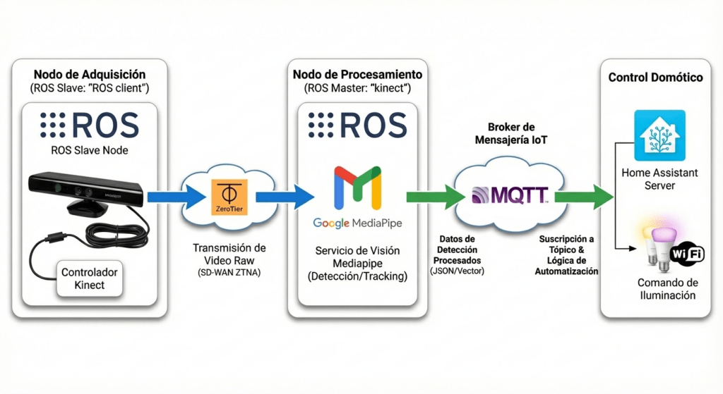 - Distribución de funciones entre maestro y esclavo: El segundo de los aspectos era el de la distribución de la lógica. En la configuración local, en líneas generales, se realizaban dos acciones: reconocer y procesar la información proveniente del sensor Kinect, publicándola en un topic ROS para que pudiera ser consumida; y el procesamiento mediante Machine Learning de la secuencia de vídeo por parte de MediaPipe, realizando el procesamiento esquelético, reconocimiento de gestos, y publicación en MQTT para control domótico. La primera de las acciones tiene una carga de trabajo limitada, mientras que la segunda es intensiva en capacidad de cómputo. Era obvio que lo adecuado era dejar la primera acción para el nodo esclavo y la segunda para el maestro. Esto permitía, además, que el nodo esclavo fuera ligero y con unas necesidades de cómputo livianas, lo que permitía el uso de sistemas muy compactos. En cuanto al segundo, al estar ya libre de sensórica física, lo habilitaba para ser desplegado en cualquier ubicación y con cualquier potencia de cálculo.