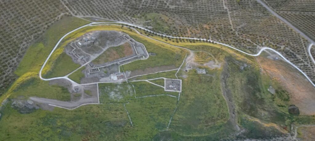 Como se puede apreciar en este vuelo de dron, el actual Yacimiento Arqueológico de Ategua (ubicado en la barriada de Santa Cruz) nos muestra la imponente acrópolis que domina el paisaje. A pesar de los siglos, todavía se distinguen las estructuras que desafiaron a César.