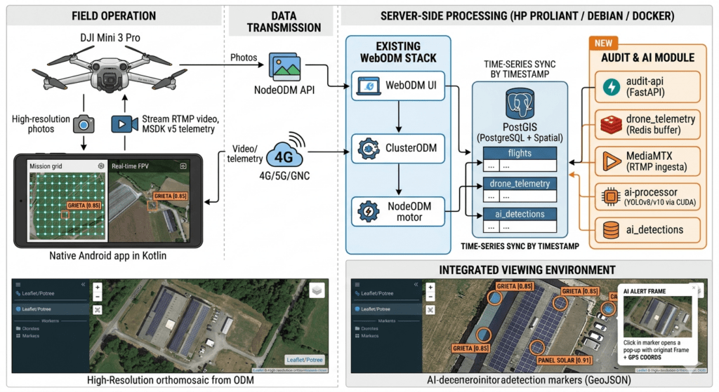 El módulo que describo en este artículo cierra esa carencia. Es una extensión del servidor de procesado que ya describí en el artículo sobre la plataforma ODM: añade un pipeline de vídeo en tiempo real que opera en paralelo al flujo fotogramétrico existente, sin interferir con él, y que permite detectar hallazgos durante el vuelo y georreferenciarlos automáticamente sobre el ortomosaico.
