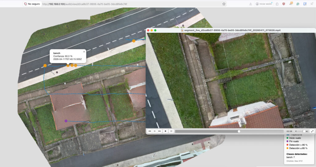 Durante el desarrollo surgió una funcionalidad que no estaba en el planteamiento inicial pero que tiene mucho sentido: la posibilidad de re-analizar a posteriori los vídeos grabados por MediaMTX. El caso de uso es directo: si después de un vuelo se quiere aplicar un modelo diferente, bajar el umbral de confianza, o simplemente revisar un vuelo anterior con mayor detalle, no hace falta volver a volar. El servidor tiene grabado el vídeo completo.