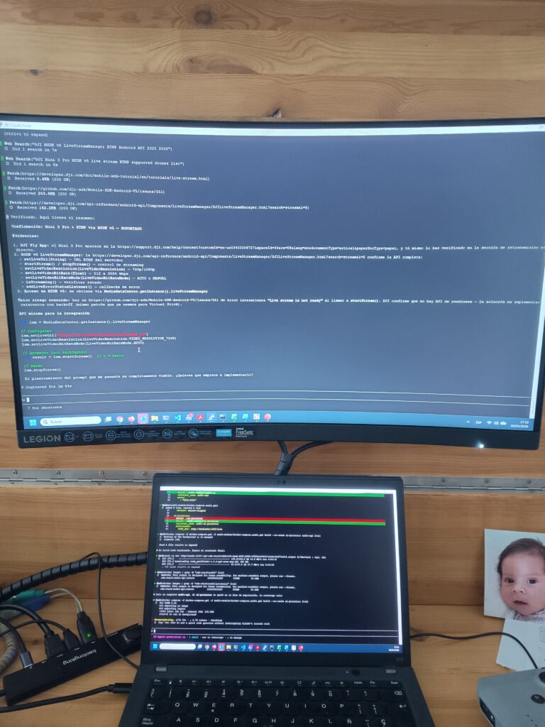 Con este módulo desplegado, el servidor ofrece ya las dos capacidades del sistema completo: fotogrametría diferida con ODM y auditoría en tiempo real con YOLOv8. Lo que queda pendiente es conectar ambas desde la app Android: que la app inicie automáticamente el stream RTMP al comenzar una misión, envíe la telemetría al módulo de auditoría, y muestre las alertas de detección en la pantalla del operador durante el vuelo. Eso es el contenido de la Fase 5 de la app, pero eso quedará para un siguiente artículo de la serie.