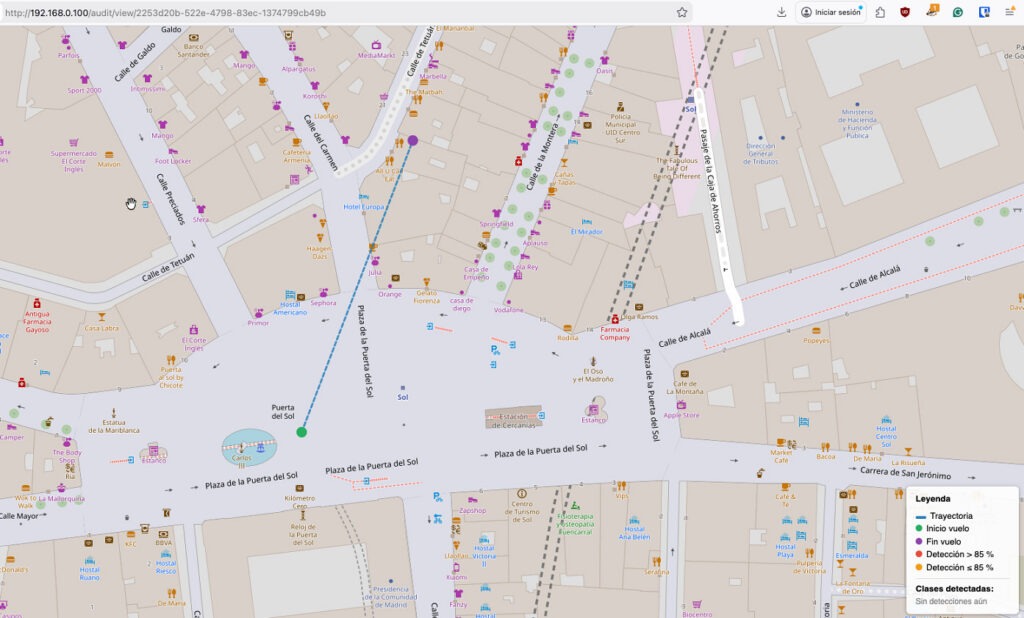 - El GeoJSON completo con trayectoria y detecciones estaba disponible en el servidor.