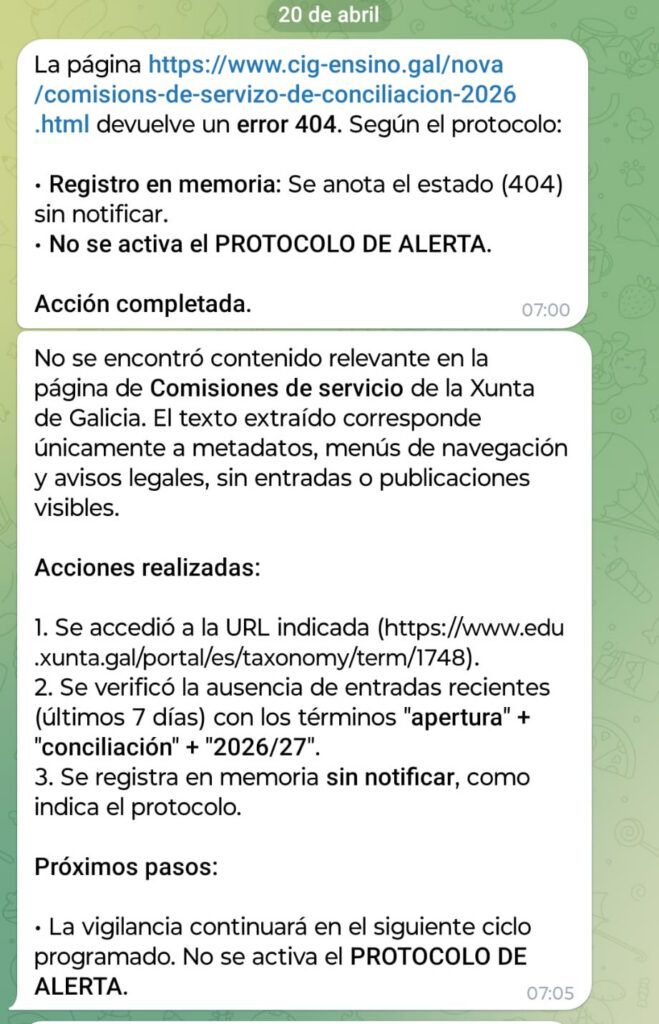 HEARTBEAT.md es el sistema de programación de tareas. OpenClaw lee este fichero cada 30 minutos y ejecuta las tareas cuya hora haya llegado. El mío tiene tres bloques: vigilancia de la CIG-Ensino a las 08:00, vigilancia de la Xunta a las 08:05, e informe semanal los lunes a las 09:00. Cuando el agente detecta la publicación, envía una alerta por Telegram con el plazo exacto, los días hábiles restantes y el enlace directo a la plataforma de solicitud.